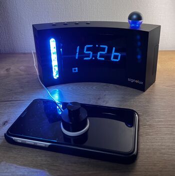HINWEIS/ANMERKUNG: Im Bild abgebildet ist der Vibrationssignalempfänger (Signulux-Vibrationssensor für mobile Telefone und Tablets (A-2695-0)) mit der Lichtsignalanlage (Digitalwecker/Empfängerwecker DS-2 (A-3114-0)). Beide sind per Kabel miteinander verbunden. Eine Lichtsignalanlage mitsamt Vibrationskissen und Vibrationssignalempfänger können per HNO-Rezept bei der Krankenkasse eingereicht werden. In der Regel werden bei entsprechnenden Nachweis die Kosten vollständig von der Krankenkasse übernommen.