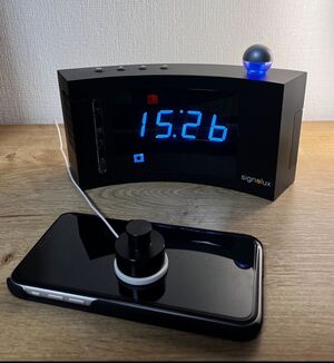 HINWEIS/ANMERKUNG: Im Bild sind der Vibrationssignalempfänger (Signulux-Vibrationssensor für mobile Telefone und Tablets (A-2695-0)) und die Lichtsignalanlage (Digitalwecker/Empfängerwecker DS-2 (A-3114-0)) abgebildet. Beide sind über Kabel miteinander verbunden. Eine Lichtsignalanlage (mitsamt Vibrationskissen) und Vibrationssignalempfänger können per HNO-Rezept bei der Krankenkasse eingereicht werden. In der Regel werden bei entsprechenden Nachweis die Kosten vollständig von der Krankenkasse übernommen.
